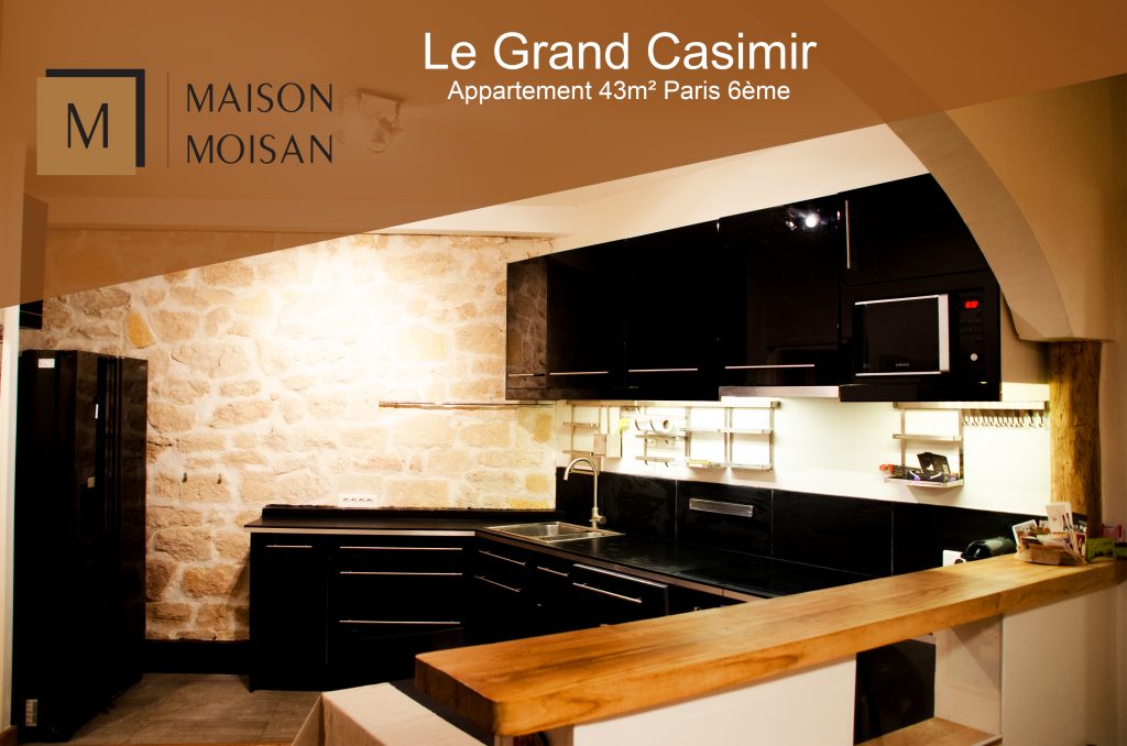 Situé au rez-de-chaussée d’un immeuble du XVIIIe siècle, le studio donne sur une cour calme et rafraichissante par les chaudes journées d’été. Murs en pierres de taille et poutres apparentes font le cachet de ce logement, alliant l’ancien et le moderne avec élégance.